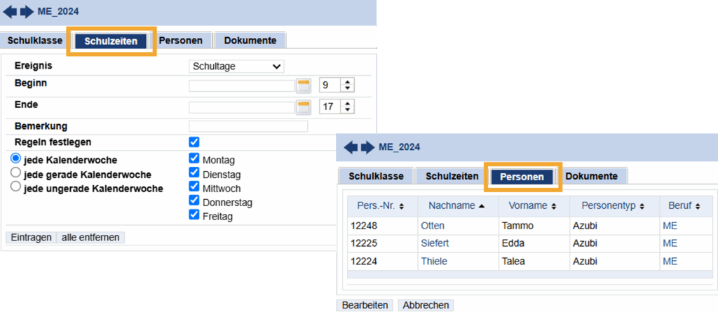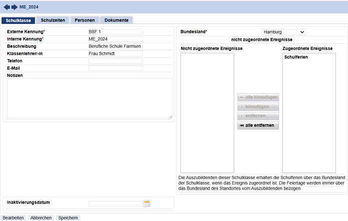 Die Anlage von (Hoch-) Schulklassen ist relevant für die Ansicht im Planungsgrid. Wichtig ist hier die Vergabe des Bundeslandes, damit die Ferien der Auszubildenden korrekt im Planungsgrid angezeigt werden. Bei den (dualen) Studenten würde man zwar das Bundesland zuordnen, aber die Schulferien nicht.