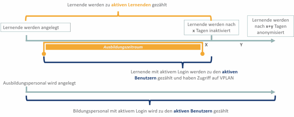 Die Eingabe des Ausbildungsbeginns- und endes in den Stammdaten einer lernenden Person legt auch gleichzeitig fest, wie lange die Lernenden auf VPLAN und ihre eigenen Daten zugreifen können und somit eine Lizenz belegen.